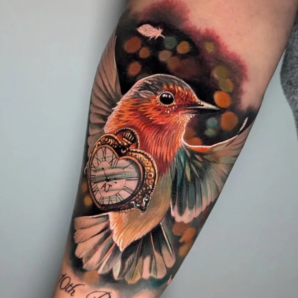 A vibrant robin in flight takes center stage in this colorful memorial tattoo, its feathers detailed in orange and soft browns, wings spread in motion. Clutched close to its chest is a heart-shaped pocket watch inscribed with initials “AJ.” The robin, often seen as a messenger from the spirit world, symbolizes a loved one’s presence nearby, reminding the living that they are never truly gone.