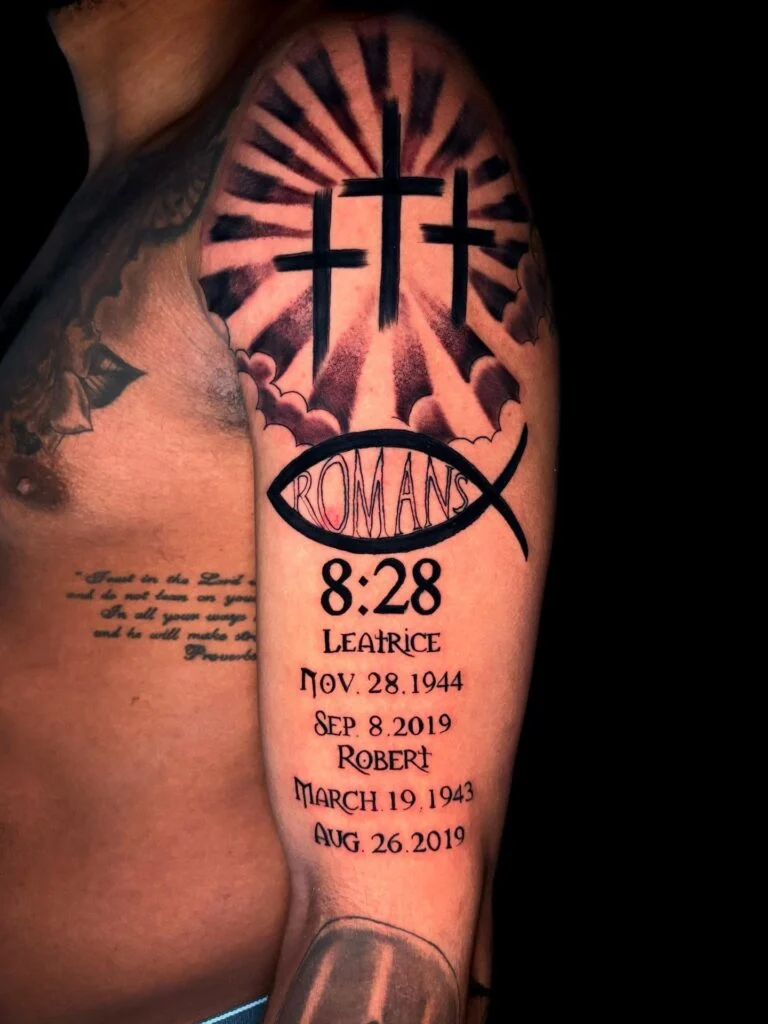 Bold and scripture-based, this tattoo immortalizes Romans 8:28: “All things work together for good to them that love God.” Above, three crosses rise with radiant beams of light piercing the sky, symbolizing salvation and eternal faith. Beneath, the names Leatrice and Robert are etched alongside their birth and passing dates, grounding the tribute in personal remembrance.