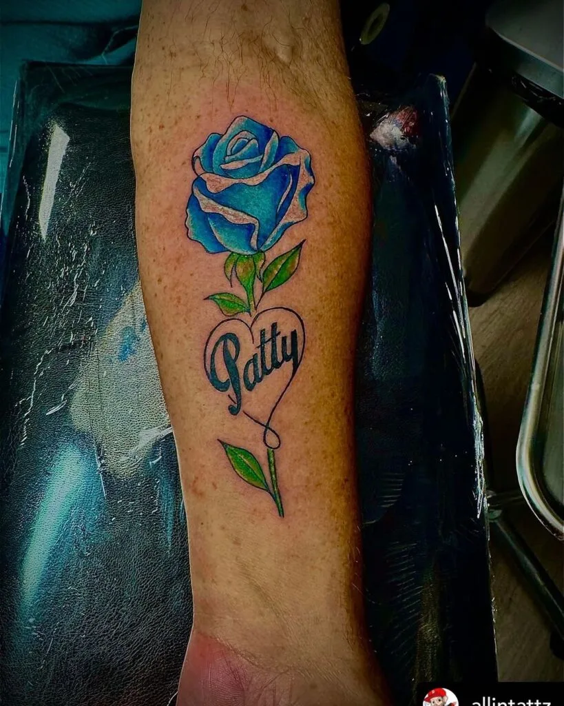 The blue rose tattoo symbolizes the extraordinary, the rare, and the impossible—capturing the uniqueness of the loved one it honors. Below the vibrant flower, the name “Patty” rests within a heart-shaped stem design, anchoring the tribute with intimacy and love.