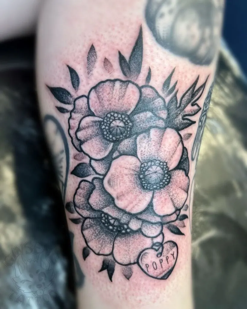 This black and gray memorial tattoo carries soft shading and stippling to create delicate poppy blossoms. Unlike the vivid red of traditional poppies, this monochrome design focuses on quiet elegance and reverence. At the bottom, a heart-shaped charm inscribed with “POPPY” adds a deeply personal connection, grounding the design in love and memory.