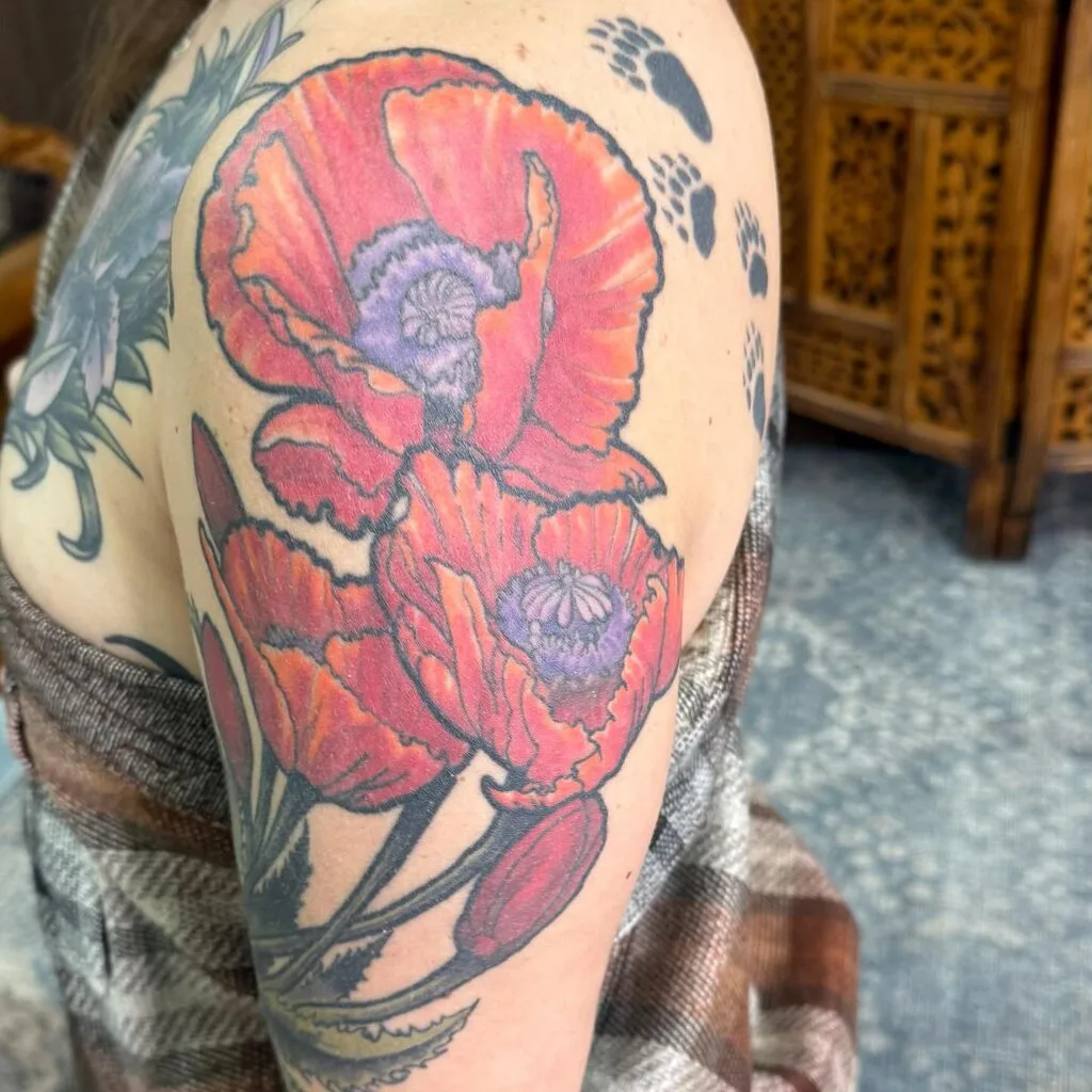 Each bloom appears alive, as if swaying gently, symbolizing both fragility and resilience. Poppies are often used to honor fallen heroes and lost loved ones, making this tattoo a timeless tribute. Positioned prominently on the shoulder, it conveys strength in carrying memory outward, not hidden. It is a daily reminder that love, sacrifice, and remembrance can remain alive through color, art, and enduring presence.