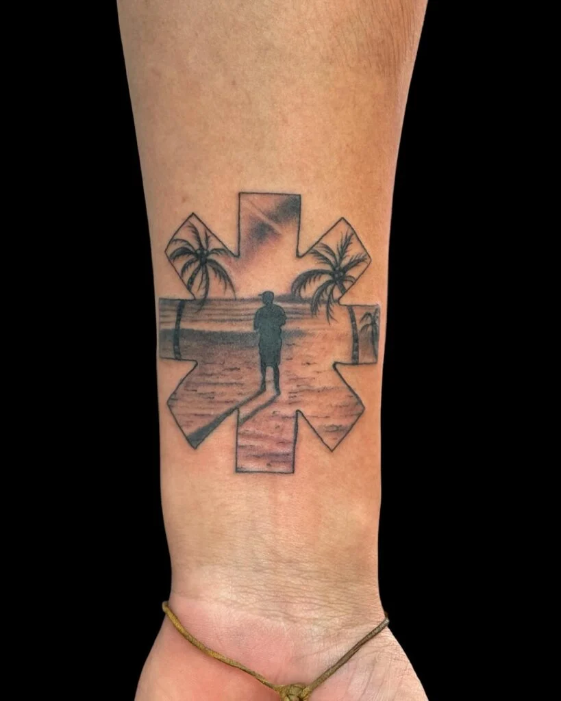 This tattoo depicts a serene scene of a lone figure standing on a beach at sunset, framed within the Star of Life—a symbol often tied to medical service and healing. The warm gradient of the sky against silhouetted palm trees creates a peaceful atmosphere, suggesting the beauty of life’s closing chapters.