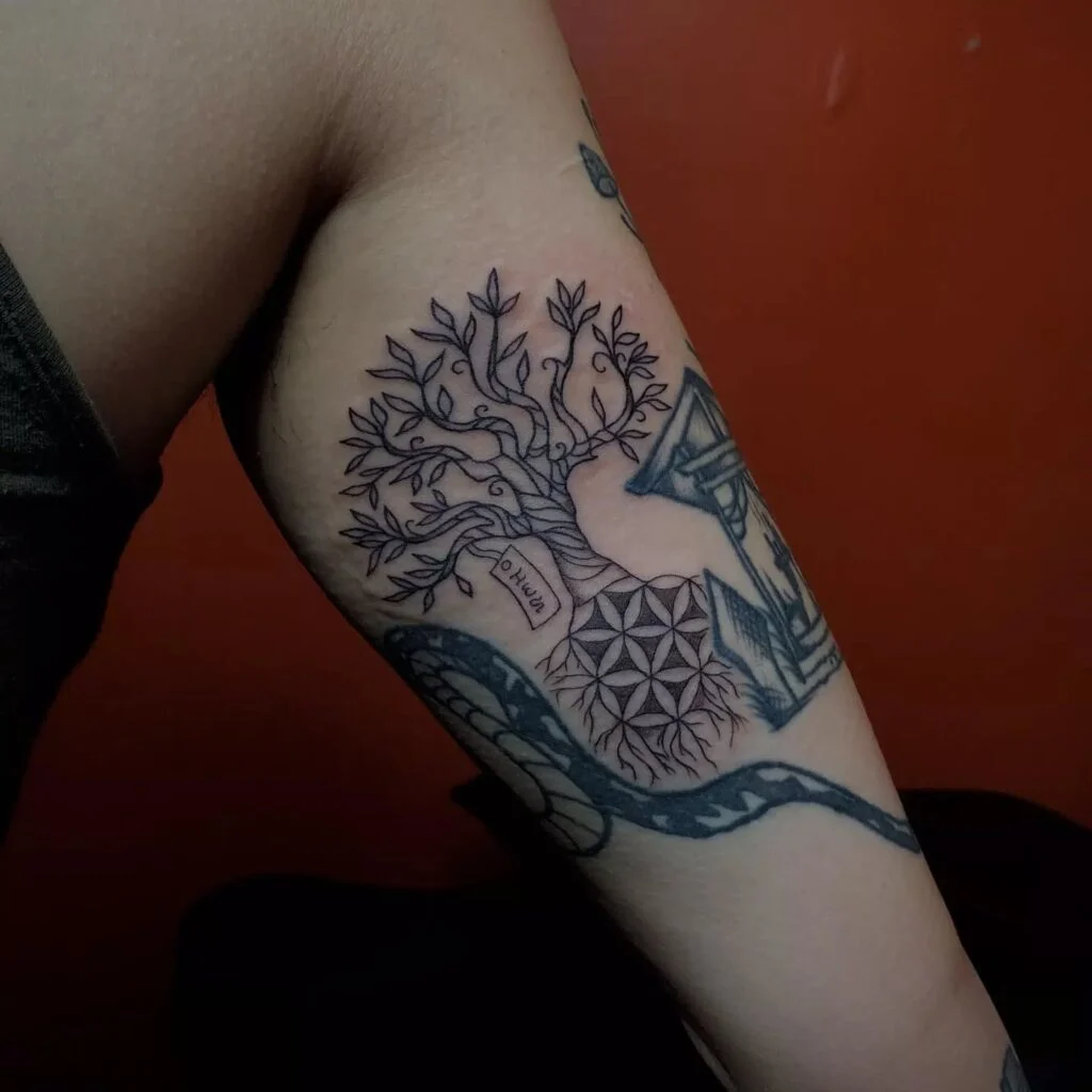 This tattoo blends the Tree of Life with an hourglass, representing both eternity and the fleeting nature of time. The roots intertwine with sacred geometric patterns, symbolizing universal connection, while a name tag reading “Joshua” personalizes the design. The hourglass reminds us of life’s fragile balance, and the flourishing branches speak to growth beyond loss.