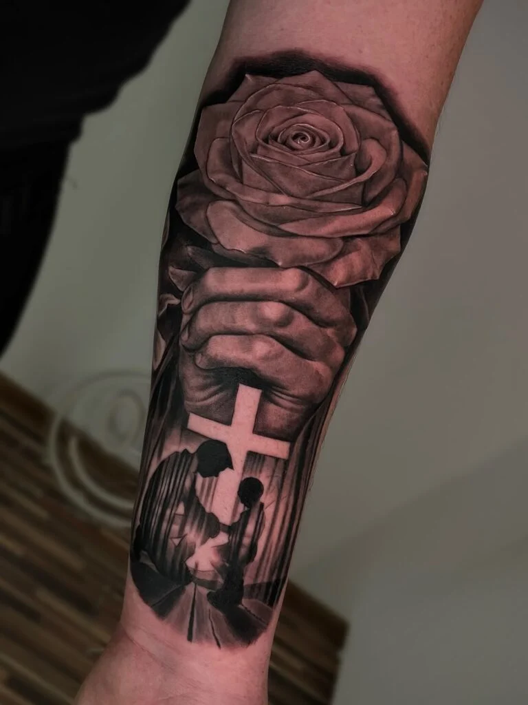 This intricate black-and-gray tattoo combines a detailed rose, a cross, and two shadowed figures in embrace below. The rose, tightly shaded, represents love and loss, while the cross signifies eternal faith and spiritual promise. Below, the silhouettes suggest reunion, a symbolic meeting beyond earthly boundaries.
