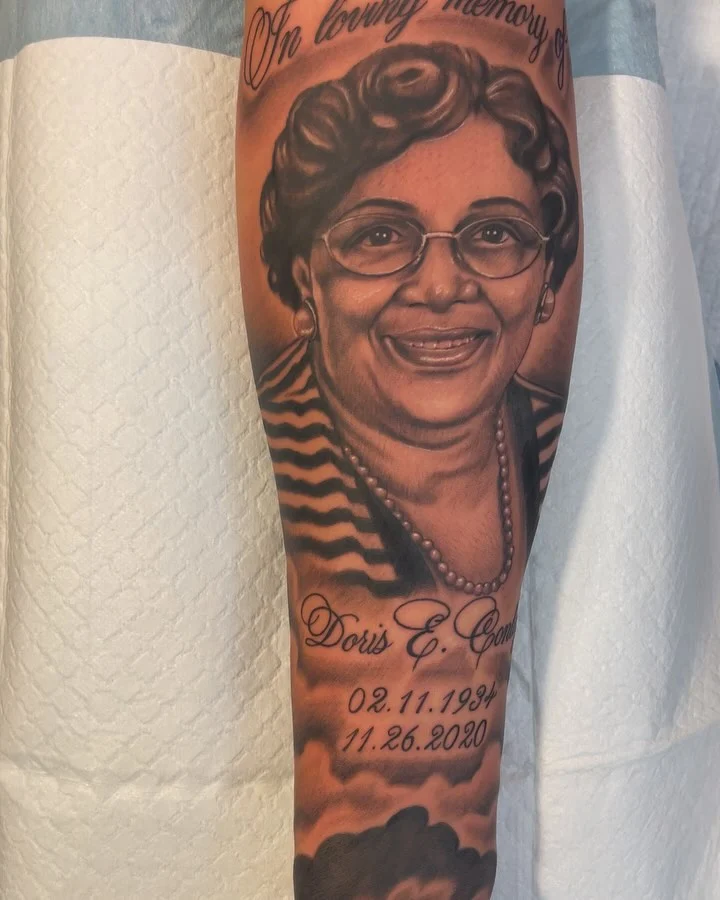 A lifelike portrait tattoo honoring Doris E. Gomes captures her warm smile and graceful presence, detailed with remarkable realism. Above, the phrase “In loving memory of” frames the piece, while her full name and birth and passing dates are inscribed below. The shading and lifelike rendering give depth and warmth, almost as if her spirit is alive on the skin.