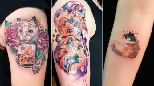 A watercolor pet tattoo adds a vibrant and artistic flair to your tribute. This design incorporates splashes of bright colors to create a painterly effect around a silhouette, paw print, or portrait of your pet.