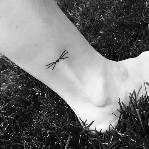 A cat whiskers tattoo is a dainty and minimalist design perfect for feline lovers. This tattoo typically features a fine-line depiction of whiskers, often accompanied by a small heart, paw print, or the pet’s name.