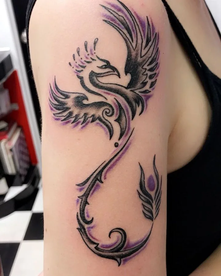 Placed on the upper arm, this tattoo is a striking emblem of rebirth and spiritual transformation. The purple highlights make it unique and artistic, adding a magical quality to the traditional phoenix motif.