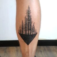 This tattoo spans the arm with a stunning forest scene. A collection of tall pine trees is rendered in deep black shading, fading into the background with a misty effect. The layered design creates a sense of depth, as though you’re looking into a real forest at dusk.
