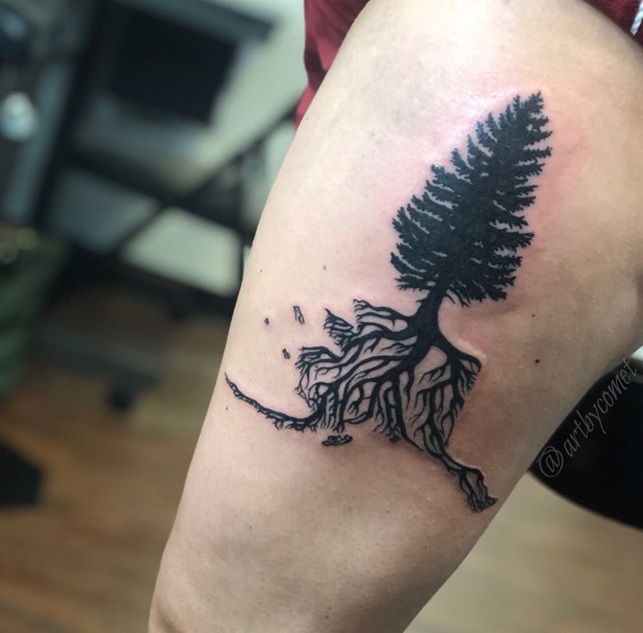 This tattoo features a bold black pine tree standing tall with roots exposed beneath it. The roots are jagged and uneven, emphasizing resilience against challenges. Small broken details suggest strength even in fragility, as the tree remains upright despite being partially exposed.