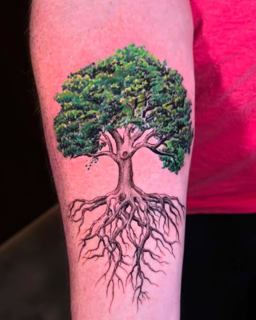 This tattoo features a lush, full tree with a canopy of vibrant green leaves contrasted against stark, dark roots. The design illustrates the harmony between flourishing growth and the unseen foundations that support it. Each leaf is shaded with bright greens and yellows, bringing life and energy to the tattoo, while the roots add a sense of permanence and grounding.