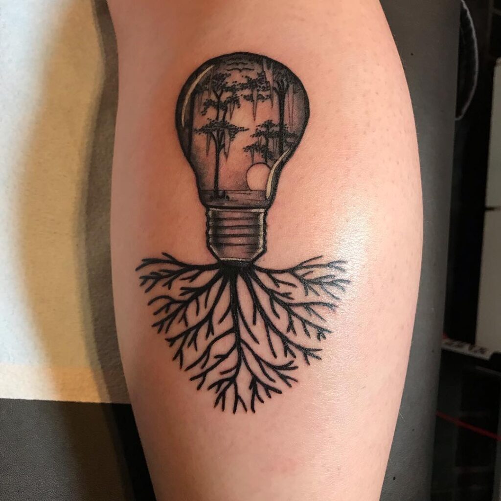 This tattoo creatively fuses a lightbulb with branching roots extending below it. Inside the bulb, a serene forest scene with trees and a sunset adds depth and tranquility. It symbolizes enlightenment, creativity, and the grounding power of nature, reminding us that inspiration often grows from strong foundations.