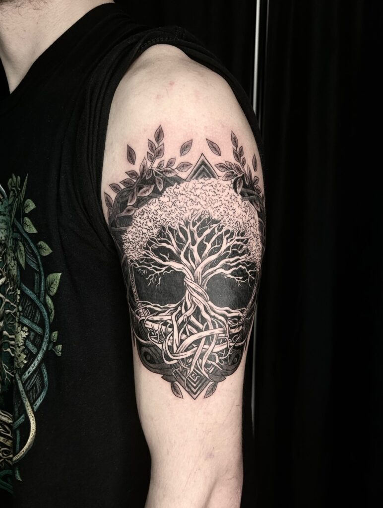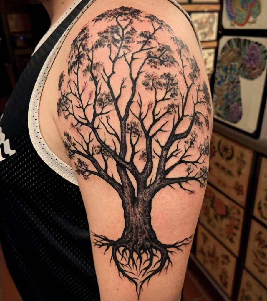This tattoo covers the shoulder with a large, expansive tree. The branches fill the upper arm with delicate detailing, while the roots spread downward into a heart-like shape. The shading adds depth, making the tree appear lifelike and vibrant.