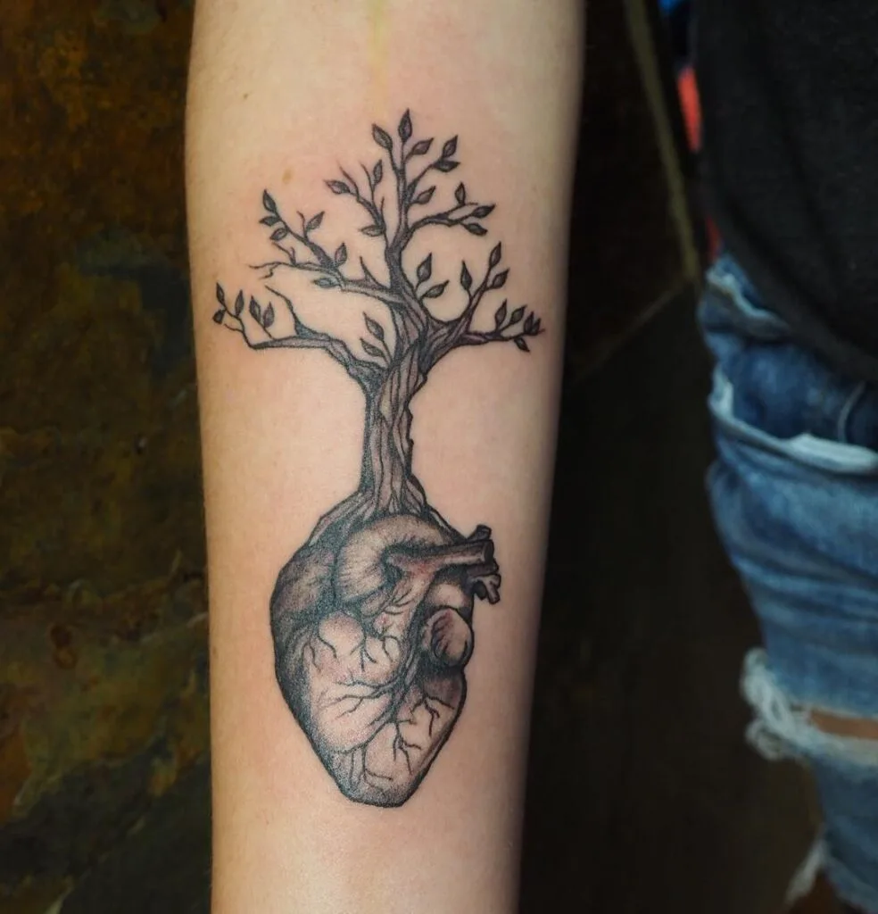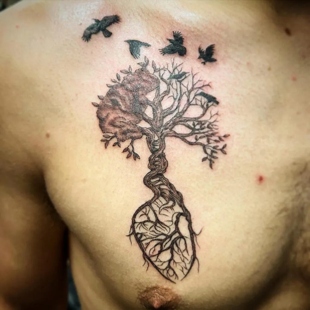 This tattoo beautifully merges the imagery of a human heart and a tree, symbolizing the deep connection between life, love, and growth. The roots extend from the heart, creating a visual metaphor for inner strength and grounding, while the branches reach upward toward freedom and possibility. Above the tree, birds in flight enhance the symbolism of liberation and transcendence.
