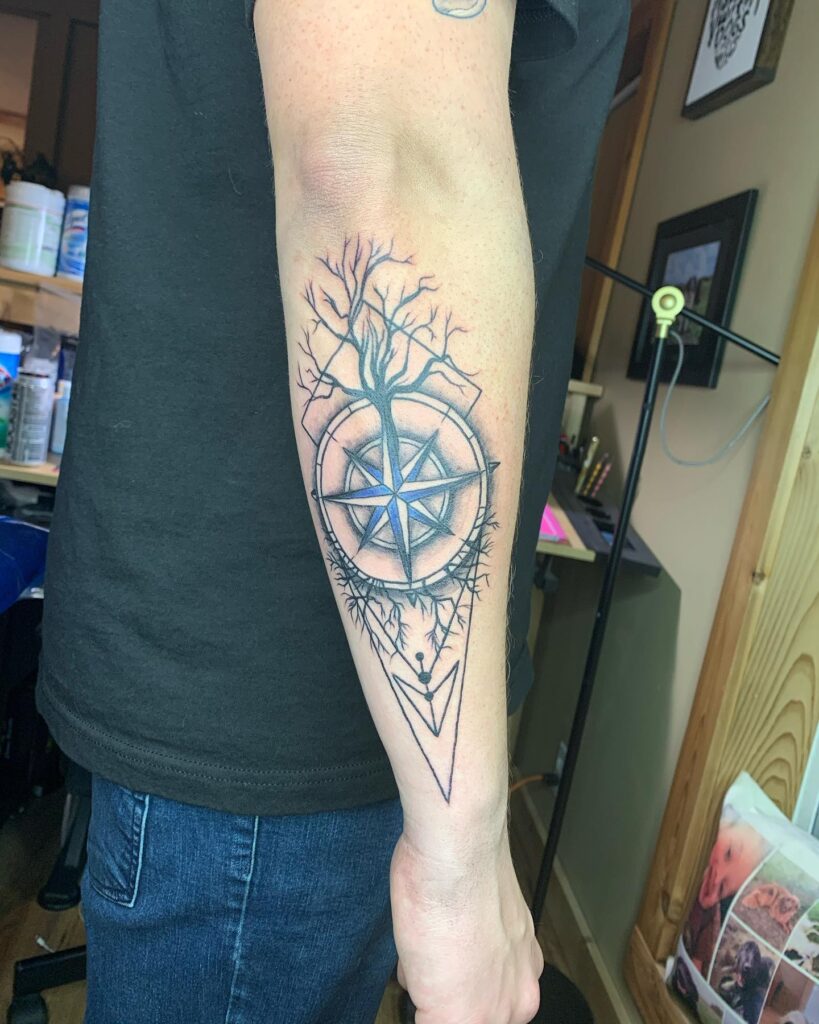 This tattoo integrates a compass with a bare tree and its sprawling roots. The compass sits at the center, symbolizing guidance and direction, while the tree represents growth and grounding. The roots extend downward with geometric accents, emphasizing strength, exploration, and the balance between wandering and staying grounded.