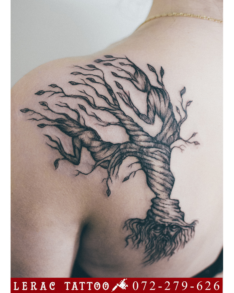 This shoulder tattoo features a tree with twisted branches and roots that resemble a hidden face within the trunk. The branches extend outward with sharp edges, while the roots curl like a beard, adding a mystical and almost mythical quality.