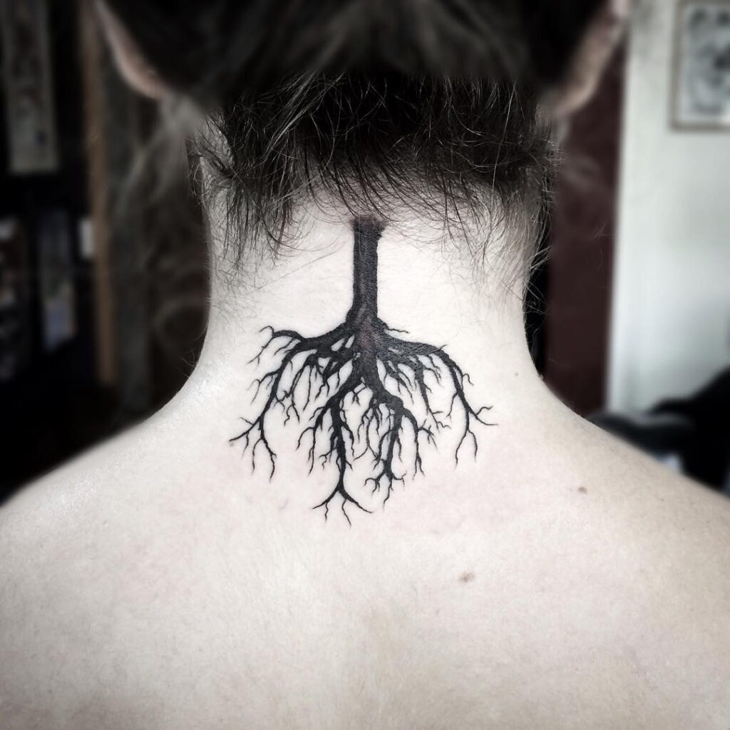 A minimalist yet powerful tattoo, this design sits neatly on the back of the neck. It shows a simple tree trunk with roots sprawling outward, resembling veins. Its placement makes it a discreet yet deeply meaningful piece, close to the base of the spine.