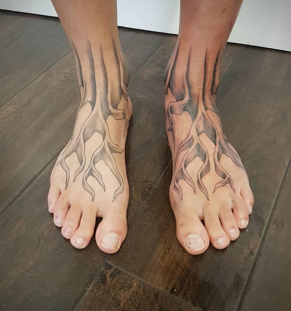 Here, roots extend from the ankles downward, spreading naturally across both feet. This design visually anchors the wearer to the earth, symbolizing stability, grounding, and a deep connection to nature. The shading creates a three-dimensional effect, making the roots look like they are truly part of the skin.