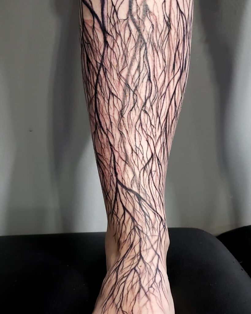 This tattoo transforms the entire leg into a living canvas of roots. Black ink lines weave down the calf, wrapping naturally around the leg to mimic the intricate network of tree roots. The sprawling, organic flow creates the illusion of being one with nature, almost like the roots are growing directly from the skin.