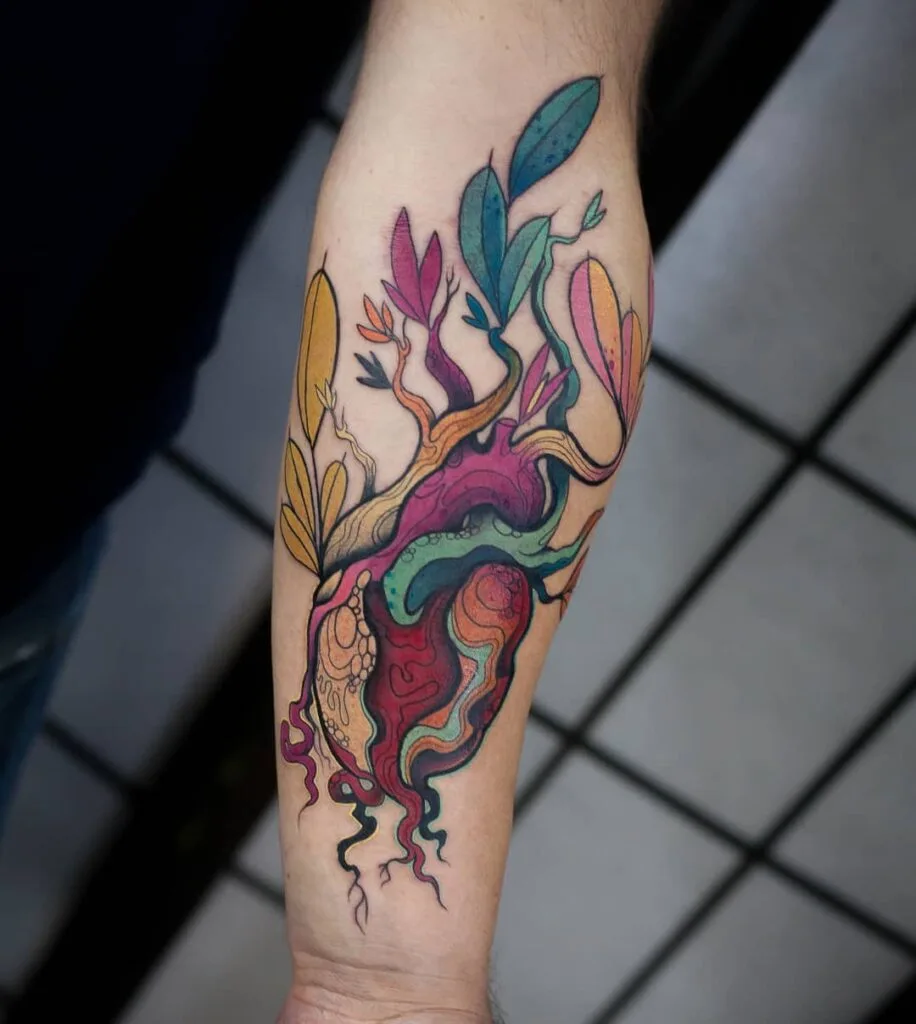 This tattoo bursts with vibrant color, blending a surreal anatomical heart with whimsical, multicolored roots and sprouting stems. Shades of pink, blue, orange, yellow, and green flow seamlessly, creating a lively and imaginative design. The organic shapes resemble both roots and vines, symbolizing creativity, individuality, and passion.