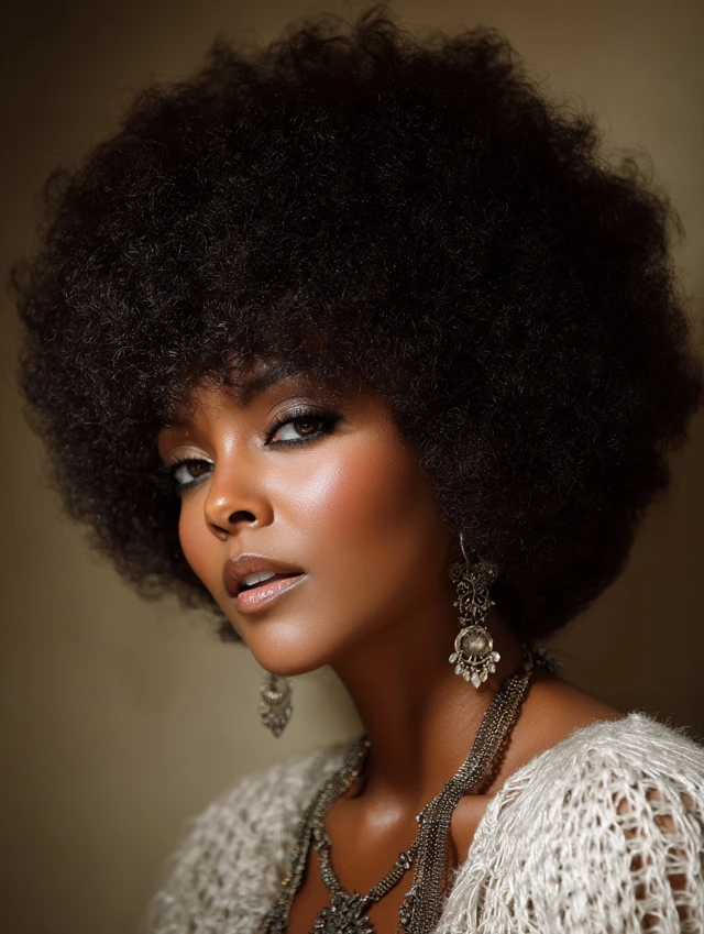 Rounded, compact afro that showcases natural coils.
