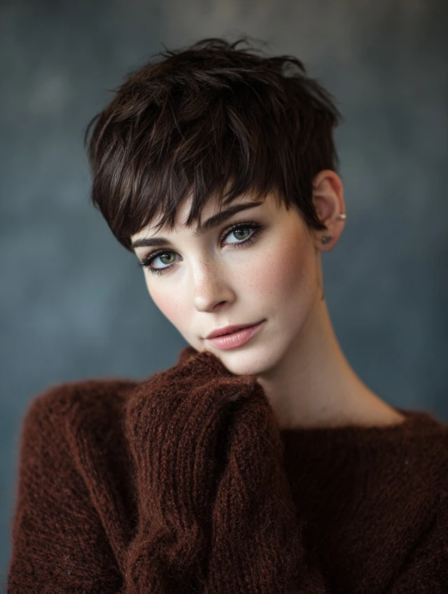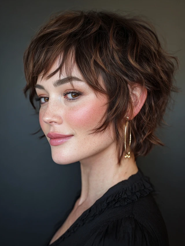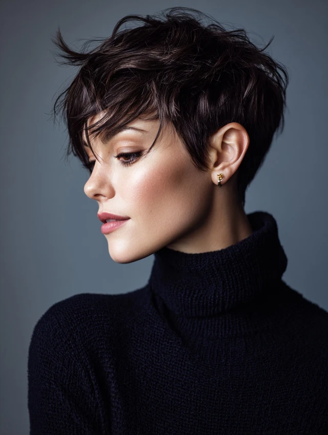 A pixie with internal layers keeps thickness controlled and chic.