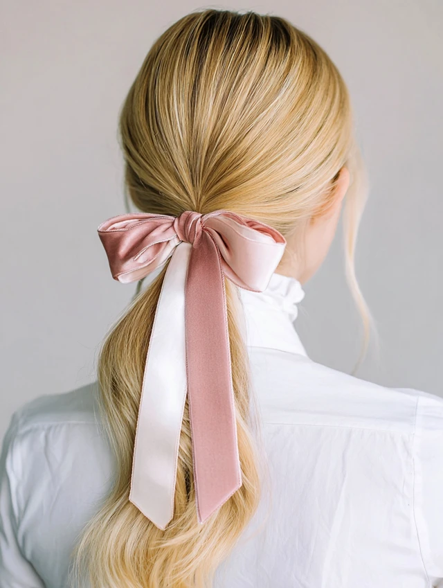 A low ponytail is effortless and neat, while a ribbon adds charm and personality.