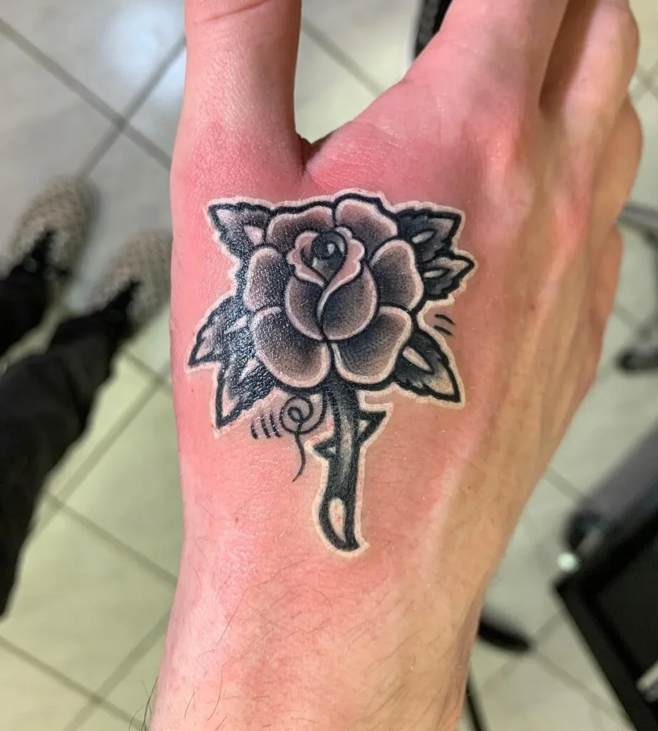 A rose on the hand symbolizes love, passion, and resilience. Its prominent placement makes it a statement piece, turning the hand into a work of art. This tattoo is perfect for someone who wants to display their romantic or passionate side with confidence and style.