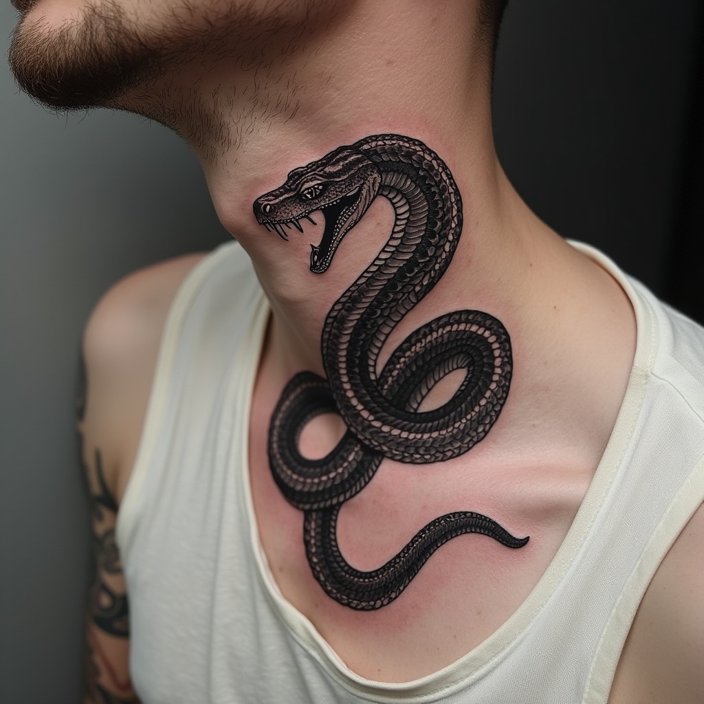 This bold blackwork design coils dramatically around the neck and upper chest, creating an intense, fearless statement. The detailed scales and open fangs make the snake look strikingly lifelike.