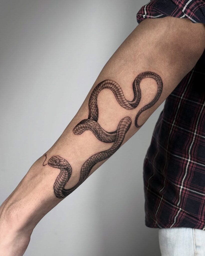 This clean, fine-line design runs gracefully along the forearm, giving the snake a natural and elegant flow. The detail in the scales makes it look realistic yet minimal.