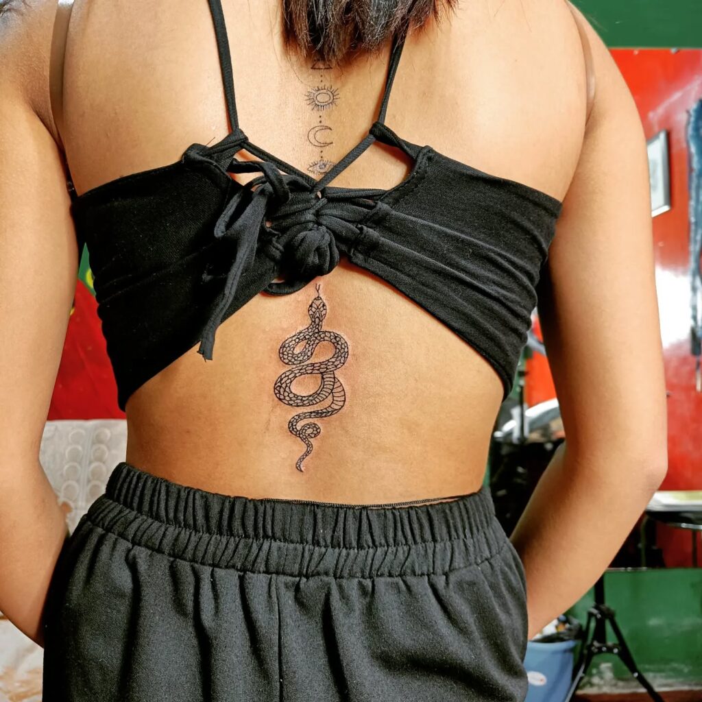 This elegant snake tattoo travels down the spine, enhancing the natural line of the back. Its fine detailing and coiling shape create a sense of balance and movement, symbolizing growth, protection, and strength.