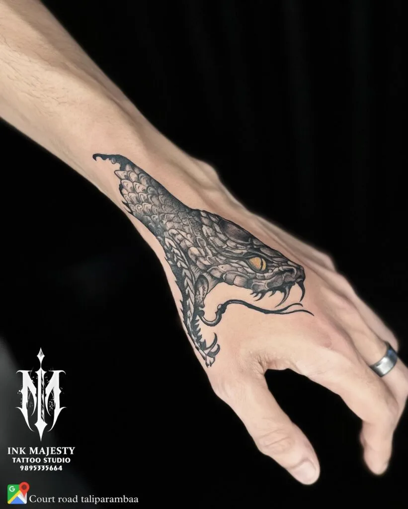 This detailed hand tattoo captures the raw, untamed essence of a serpent, with its fierce gaze and intricate scales adding depth and texture. The placement on the hand makes it a bold choice, symbolizing power and readiness.