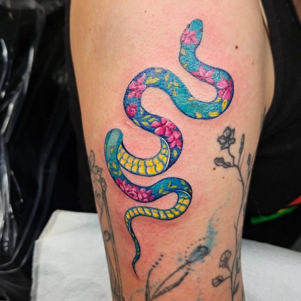 This vibrant tattoo combines the elegance of a snake with the beauty of blooming flowers, creating a design that feels alive and full of energy. The use of turquoise, yellow, and pink makes it pop beautifully against the skin.