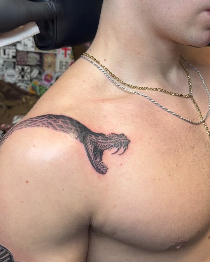 Placed right over the shoulder, this tattoo features a striking snake head with its jaws wide open, ready to strike. The shading gives the piece depth and intensity.
