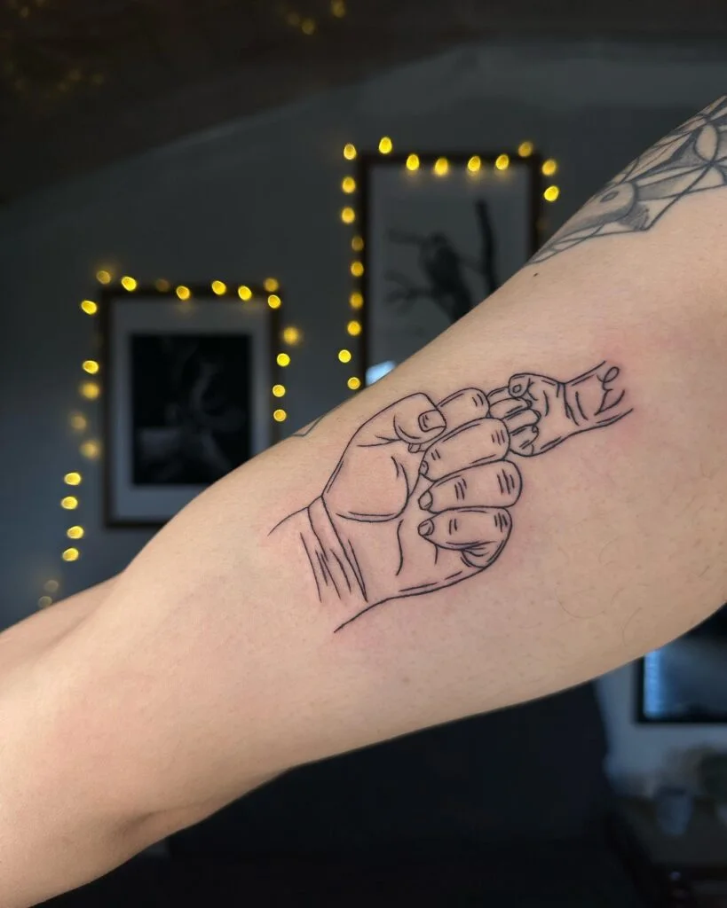 This tattoo illustrates a timeless moment—a father’s strong hand holding his baby’s tiny fingers. The fine-line simplicity makes it universal yet deeply personal. It symbolizes guidance, strength, and protection on one side, while innocence and trust shine on the other.
