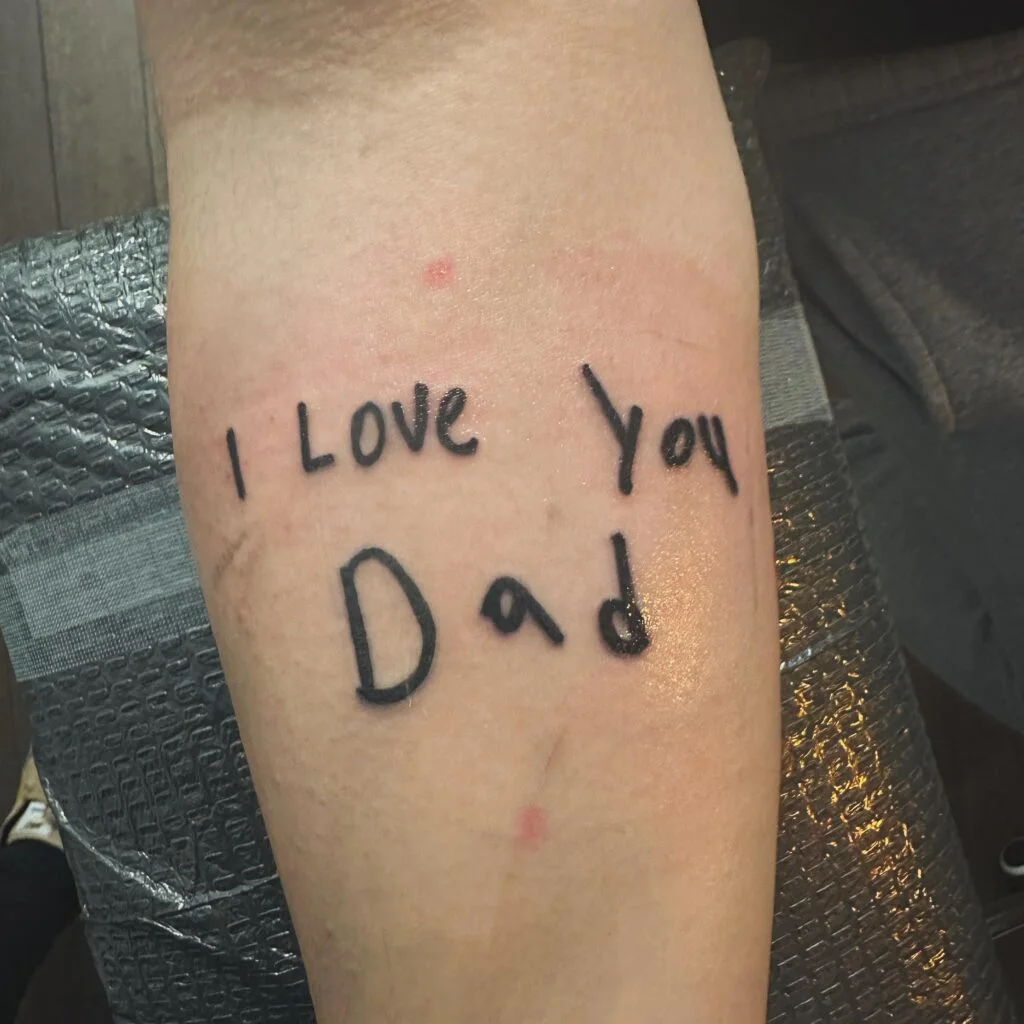 This tattoo transforms a child’s heartfelt note into permanent ink with the words, “I love you Dad.” The uneven, playful handwriting emphasizes authenticity, preserving the innocence of childhood forever.