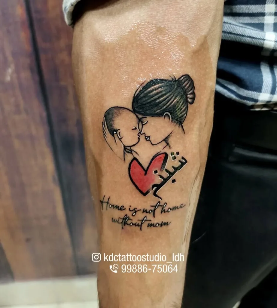 This tattoo features a mother gently embracing her child, framed by a heart with the phrase, “Home is not home without mom.” The design incorporates color, with the red heart symbolizing warmth, love, and belonging.