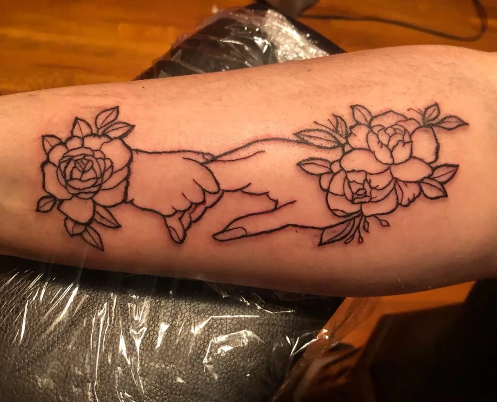 This tattoo portrays a delicate design of two hands, one larger and one smaller, holding each other’s pinky finger. Surrounding them are blooming flowers, adding beauty, growth, and life to the connection. The adult hand represents guidance and protection, while the child’s hand symbolizes innocence and reliance.