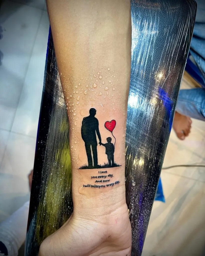 A touching silhouette tattoo depicts a father holding hands with his child, walking together beneath a red balloon heart. Below it, the words read: “I love you every day, and now I will miss you every day.”