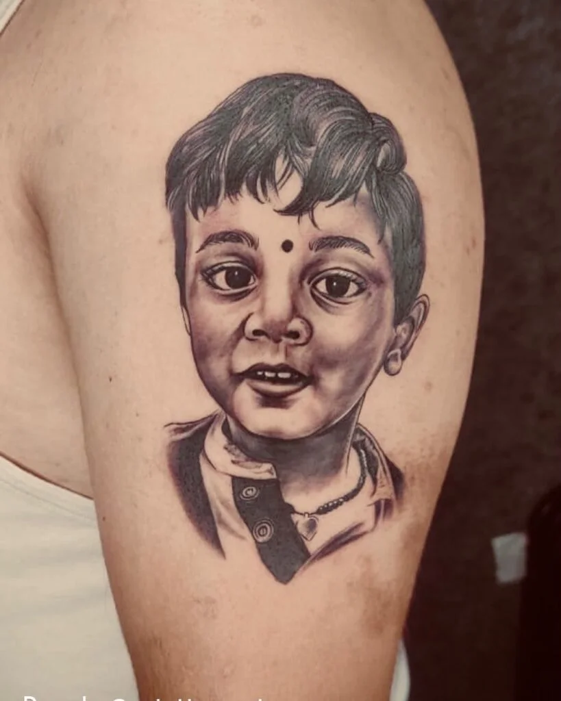 This realistic tattoo features the portrait of a young boy, complete with expressive eyes, soft curls, and a traditional bindi on the forehead. The detailed shading makes the face come alive, with every feature carefully crafted to capture likeness and innocence.