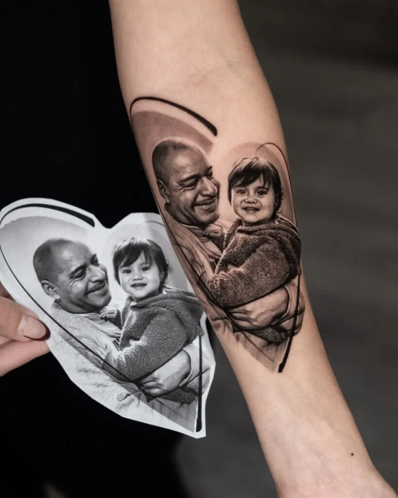 This hyper-realistic tattoo replicates a cherished photo of a father cradling his son, framed by a soft heart outline. The accuracy and shading bring the faces to life, immortalizing a memory of warmth, joy, and security.