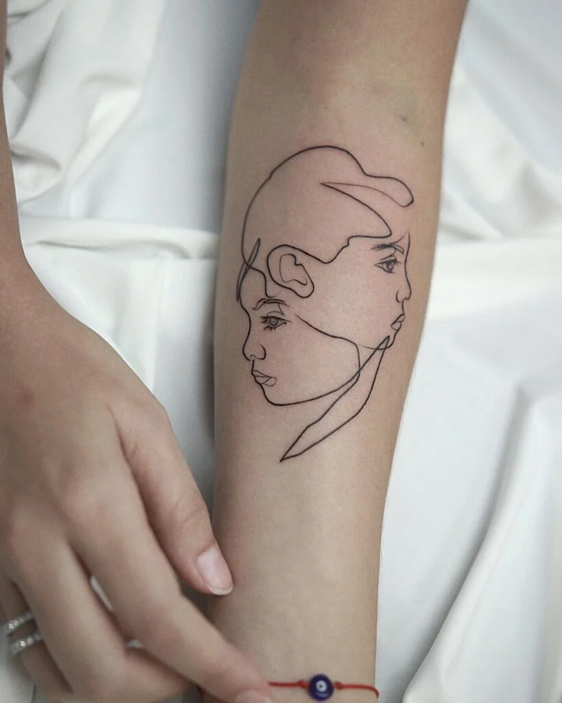 This elegant tattoo uses continuous line art to depict two overlapping profiles, capturing the connection between a parent and child in minimalist form. The clean, unbroken stroke symbolizes unity, balance, and eternal togetherness. The dual profiles, facing different directions, suggest growth and individuality while still remaining bound as one.