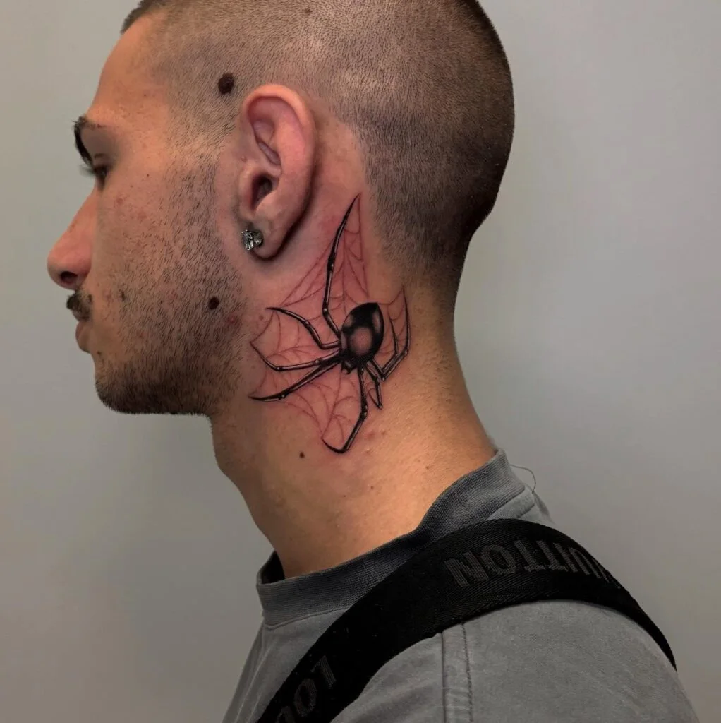 This tattoo places a realistic black spider on the side of the neck, surrounded by a faint red web design that spreads outward like a backdrop. The detail and shadowing make the spider look alive and in motion.