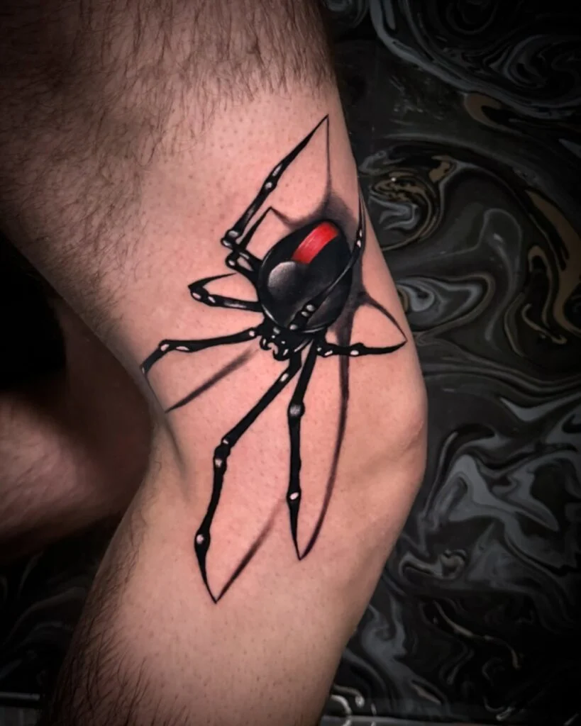 This realistic black widow tattoo sits perfectly on the side of the leg, showcasing fine details and a vibrant red marking. The artist uses smooth shading to give the spider a three-dimensional look, almost as if it is crawling across the skin.