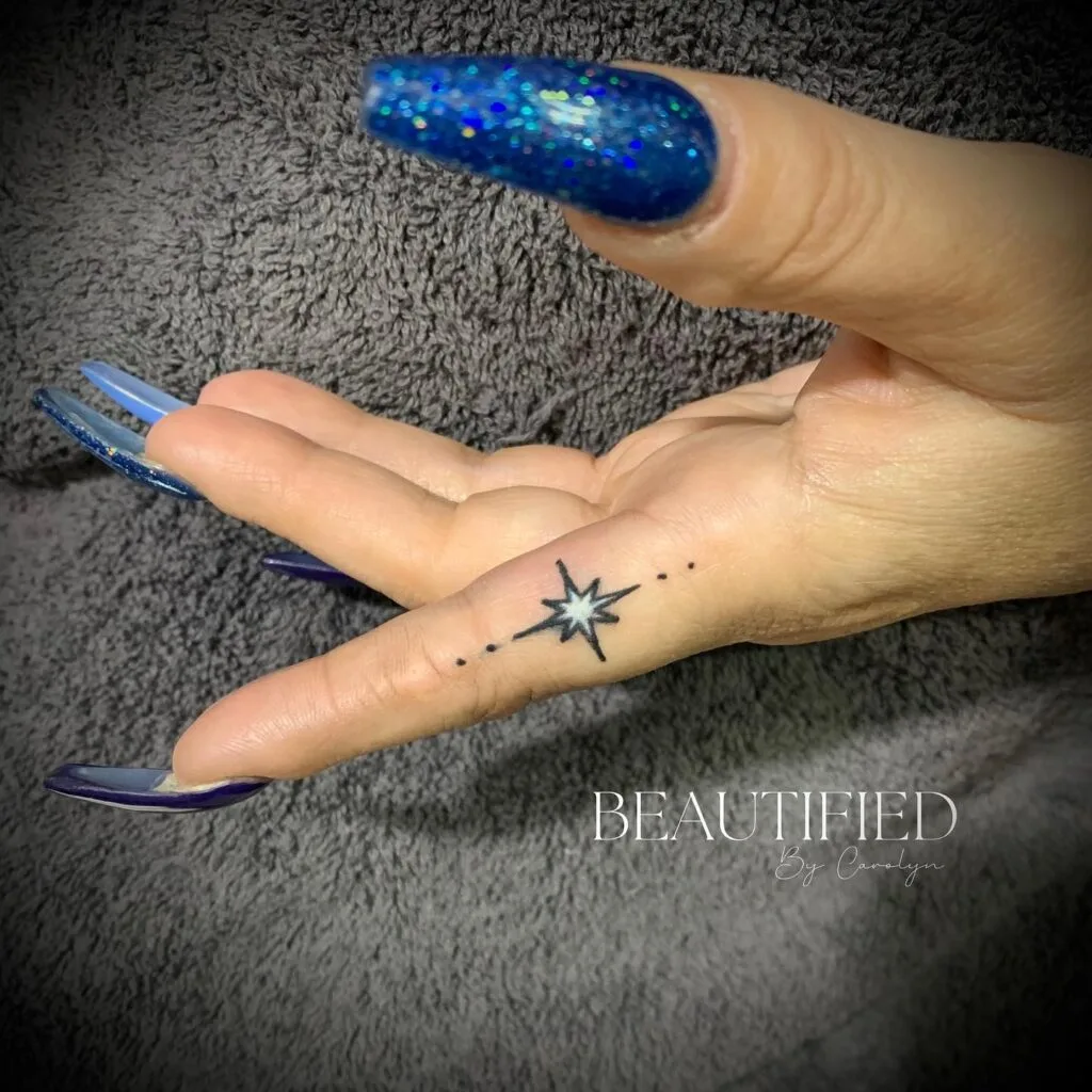 Finger tattoos are intimate and personal, often reserved for designs that hold special meaning. This one could symbolize hope, destiny, or a guiding light, perfect for someone who wants a meaningful piece that’s always visible.