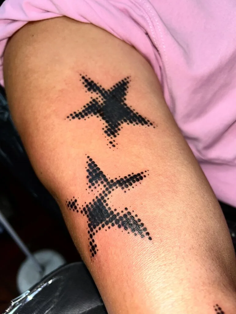 This tattoo features two bold stars created entirely with dotwork, giving it a modern, artistic look. The dots vary in size to create shading and shape, resulting in a design that feels light yet impactful. The placement on the arm makes it easy to admire and show off.
