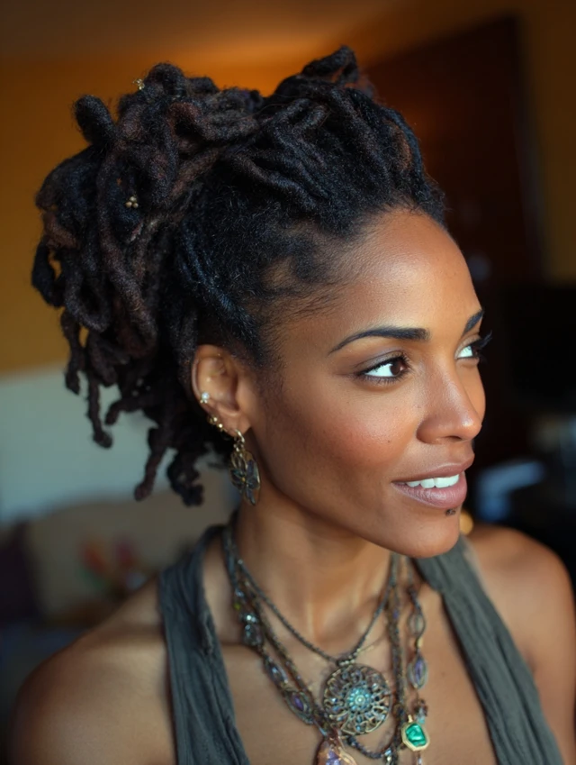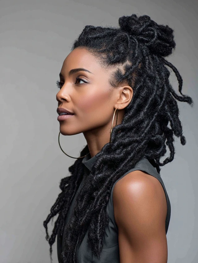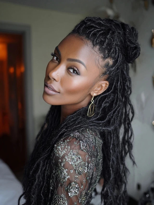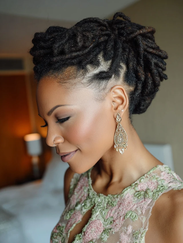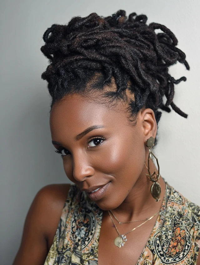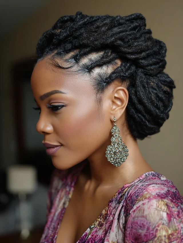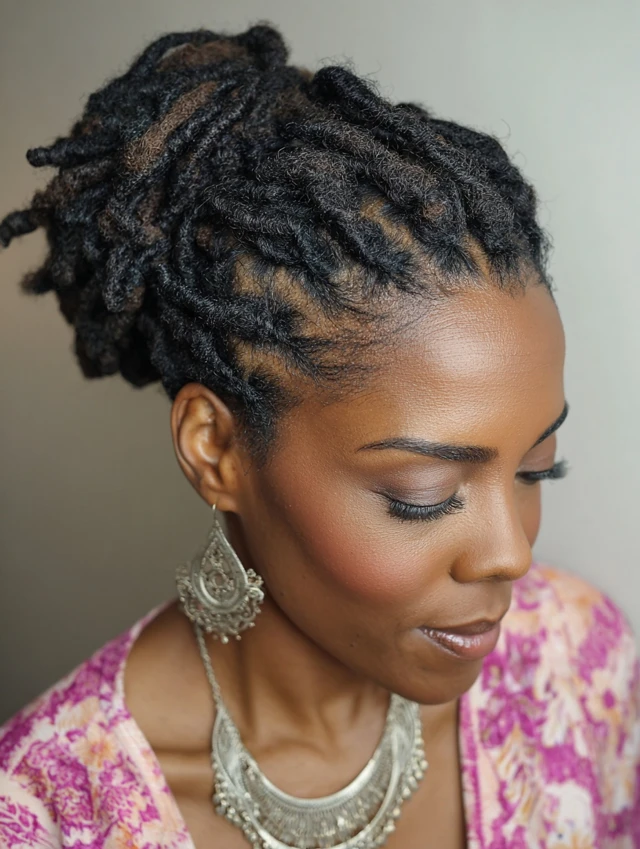 An updo with starter locs is elegant and versatile, ideal for formal occasions.