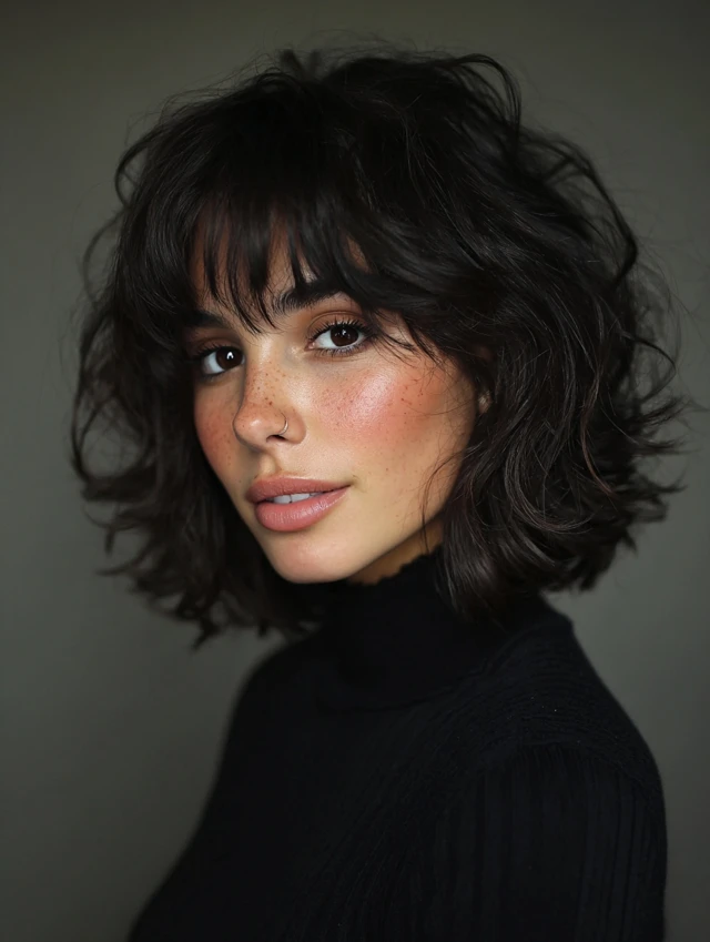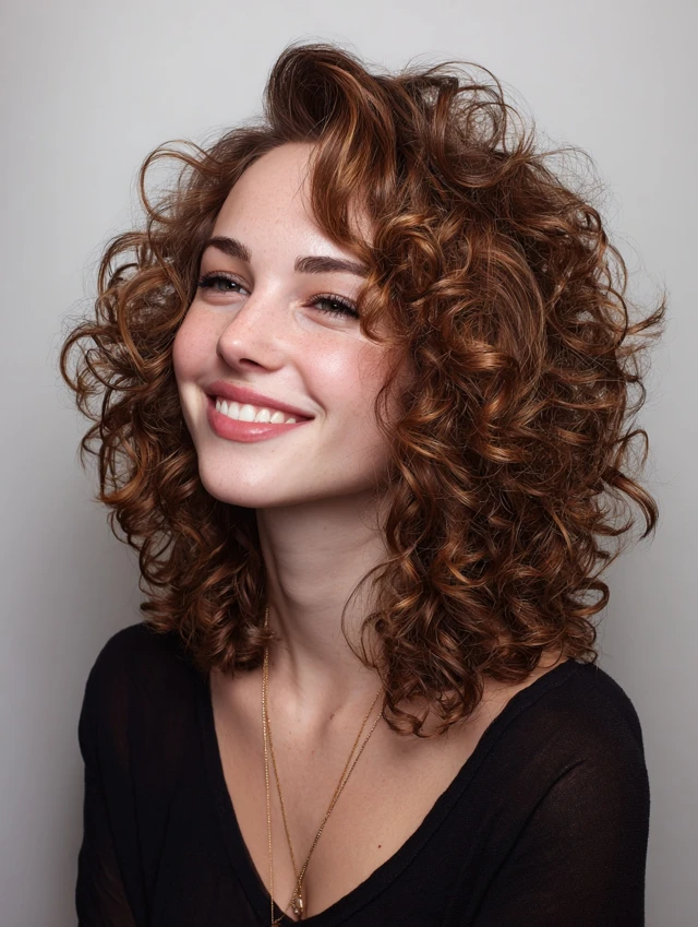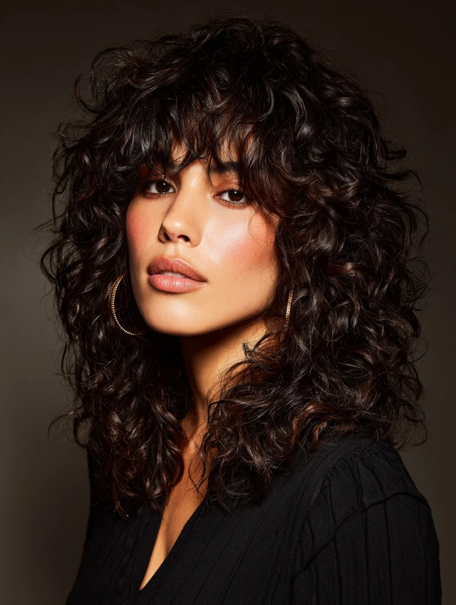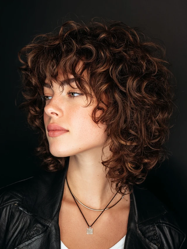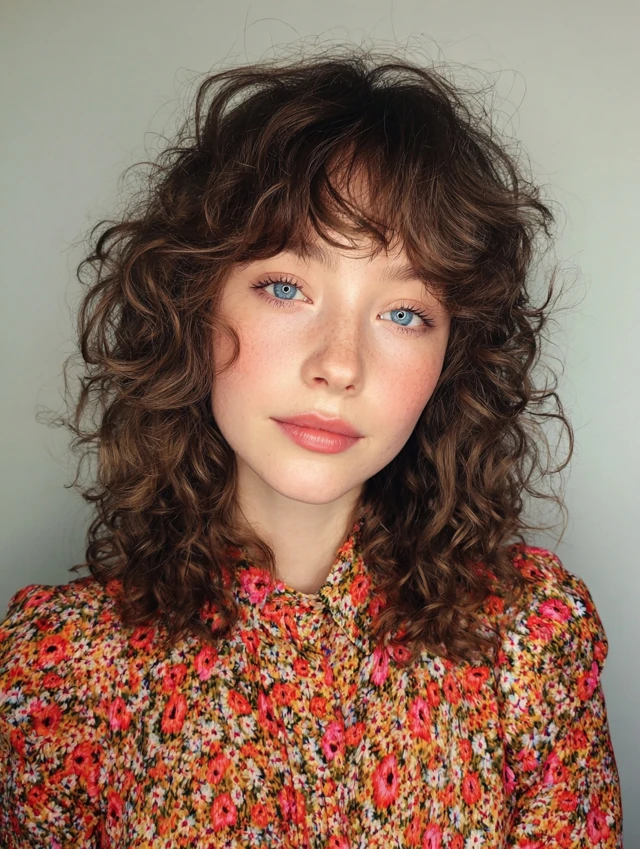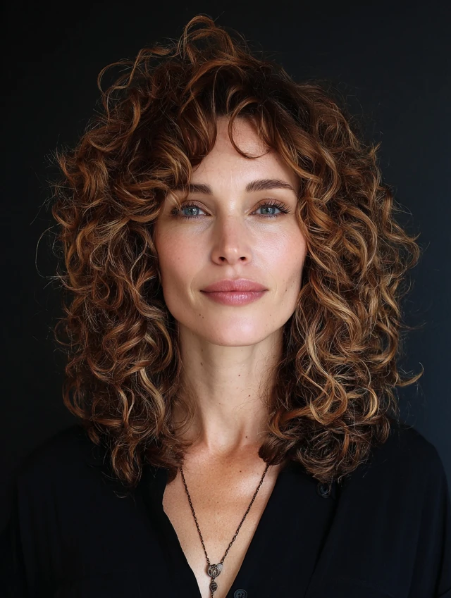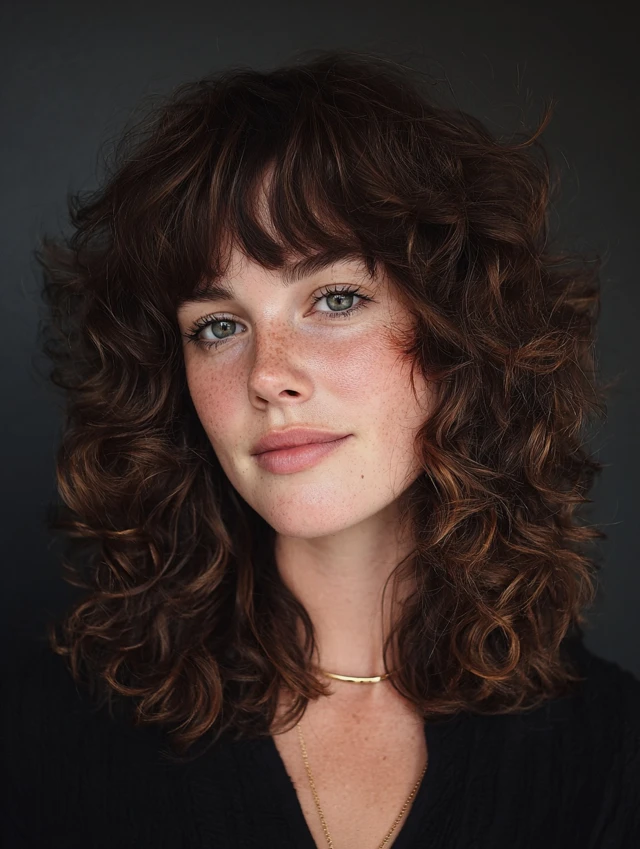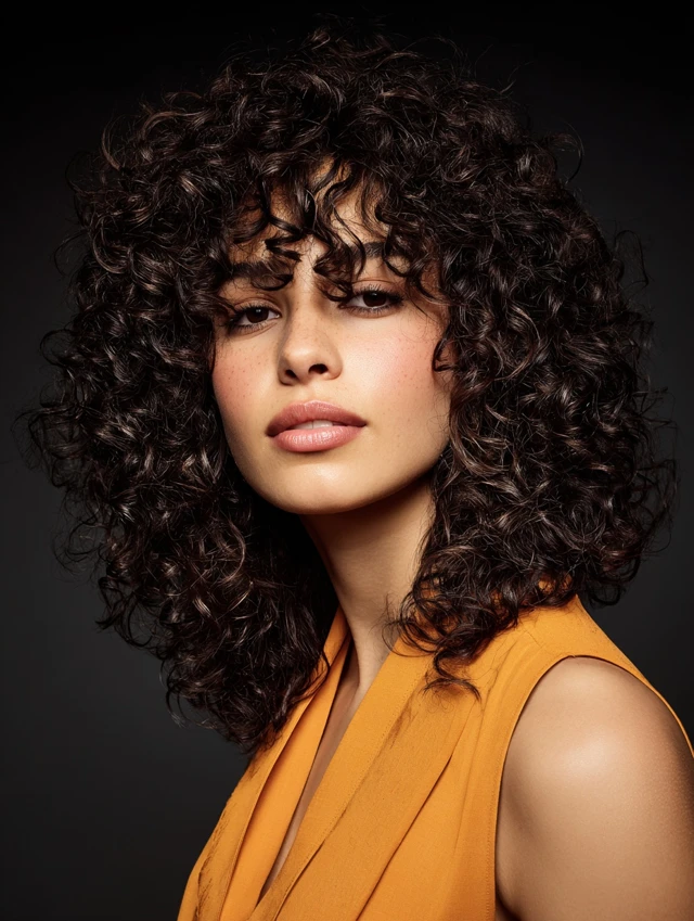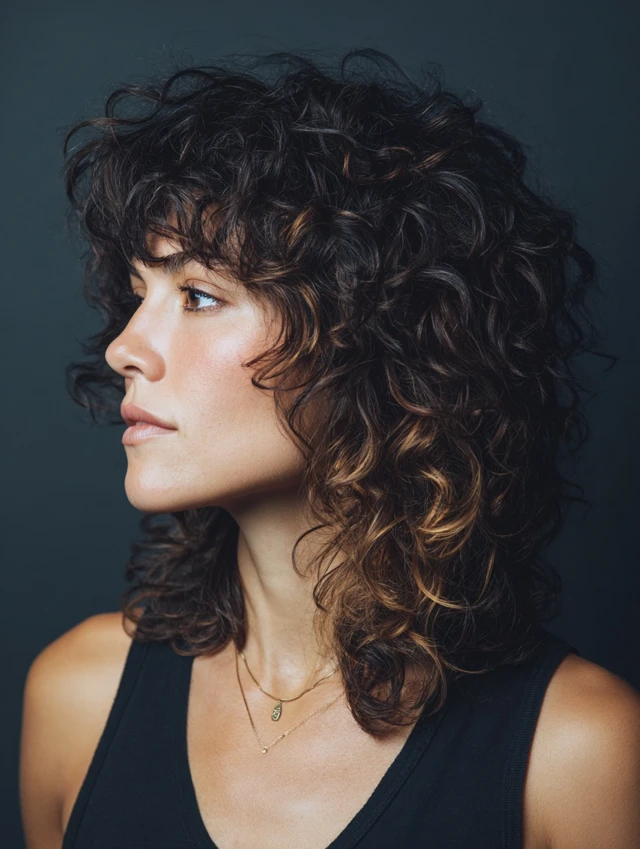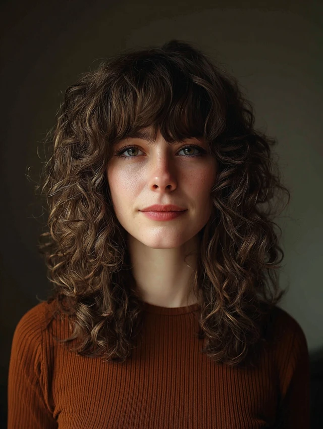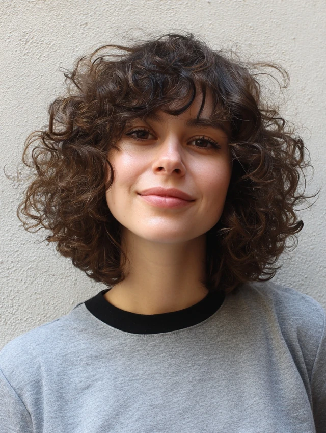 Curtain bangs gently frame the face while blending into medium curls, adding softness and dimension.