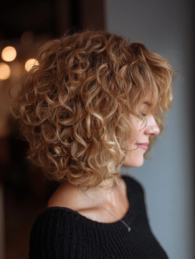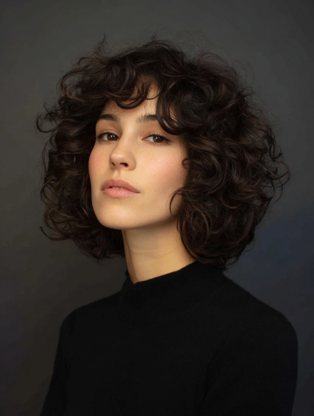 A curly bob at medium length adds springiness and prevents the dreaded “triangle” shape thanks to layered shaping.