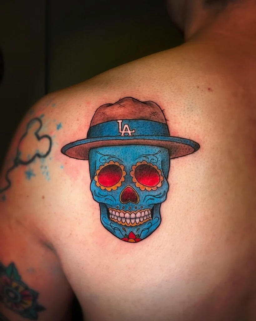 5. Blue Sugar Skull with Hat Tattoo